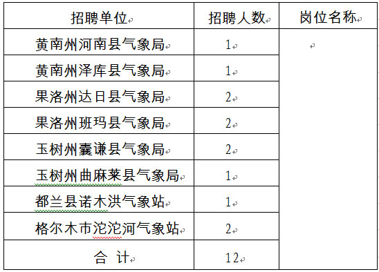 此次編外公開招聘12名艱苦臺(tái)站工作人員,主要從事綜合氣象業(yè)務(wù)崗位工作,實(shí)行人才派遣制,按照《青海省氣象部門事業(yè)單位基本業(yè)務(wù)崗位編制外勞動(dòng)用工人員管理辦法(試行)》管理。具體招聘單位和崗位名額如下。