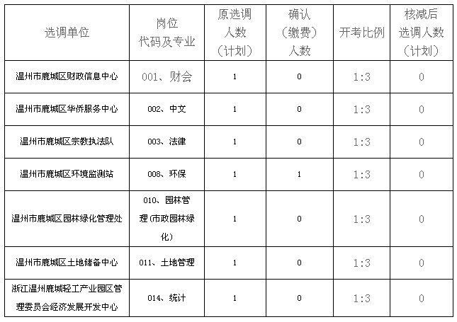 2015年下半年溫州市鹿城區(qū)事業(yè)單位公開選調(diào)工作人員繳費確認工作已結(jié)束,共有7個崗位繳費確認人數(shù)達不到規(guī)定的比例。根據(jù)《2015年下半年溫州市鹿城區(qū)事業(yè)單位公開選調(diào)工作人員公告》要求,經(jīng)研究決定,核減下列公開選調(diào)計劃。
