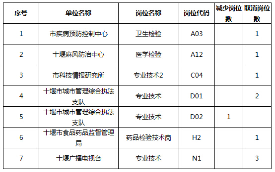 根據(jù)十堰市市直事業(yè)單位公開招聘工作人員公告,因部分崗位報名人數(shù)達不到1:3的比例,現(xiàn)將崗位減少及取消情況公布如下: