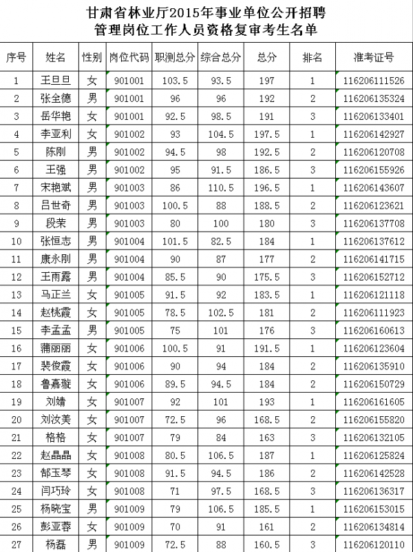 甘肅省林業(yè)廳2015年事業(yè)單位公開招聘管理崗位工作人員(省直第九期)筆試工作已經(jīng)結(jié)束,現(xiàn)就資格復審有關(guān)事項通知如下: