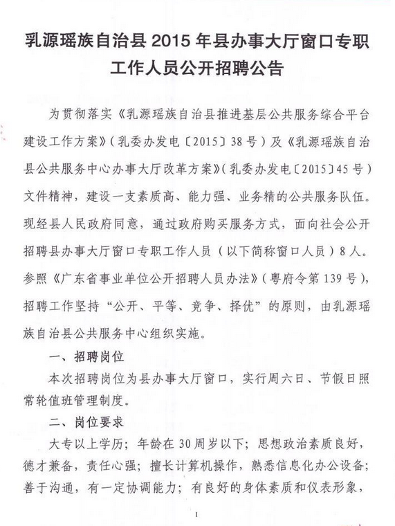 2015廣東乳源縣辦事大廳窗口專(zhuān)職人員招聘公告【招8人】