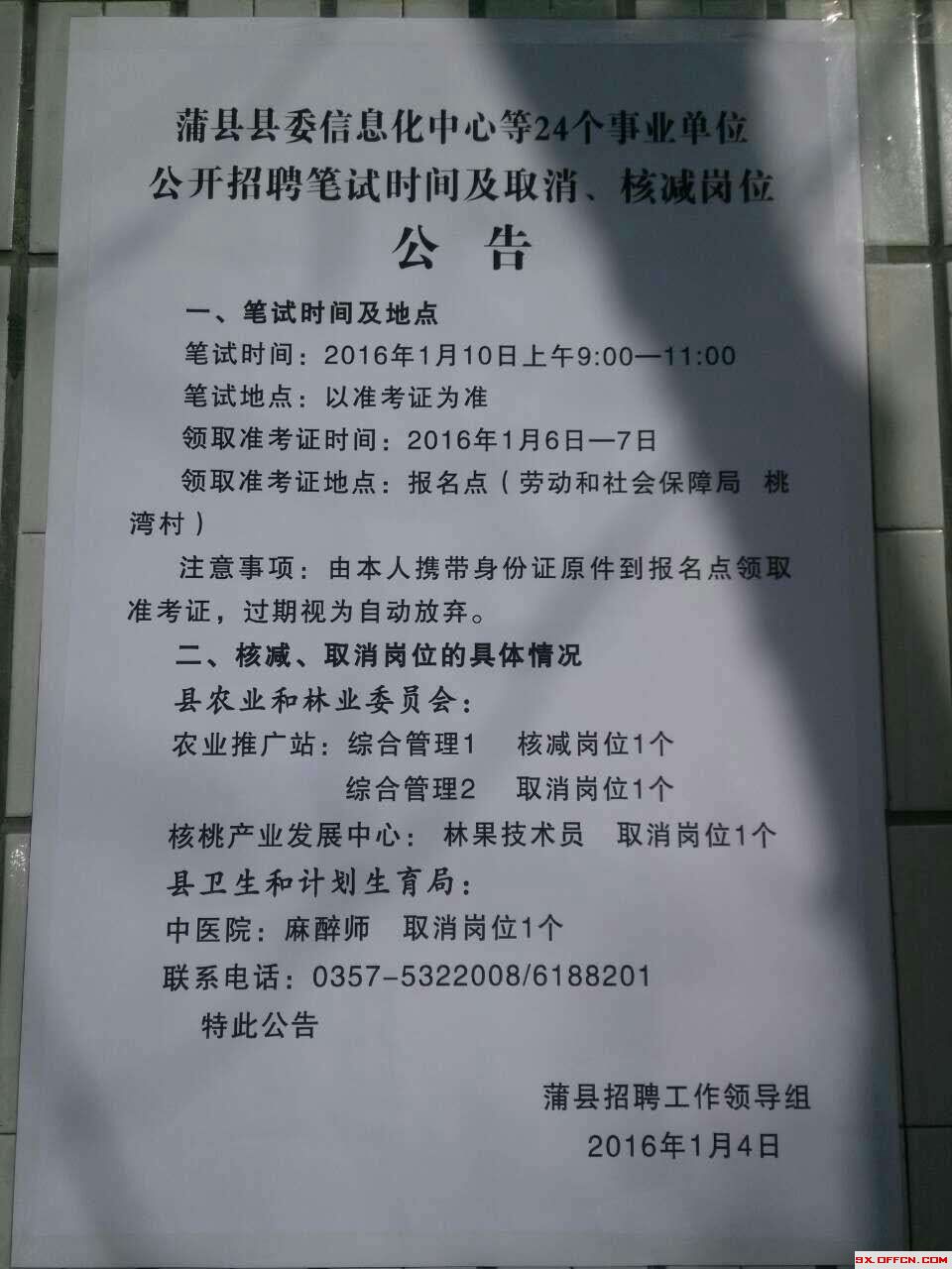 2015山西臨汾蒲縣24個(gè)事業(yè)單位招聘筆試時(shí)間及取消、核減崗位公告
