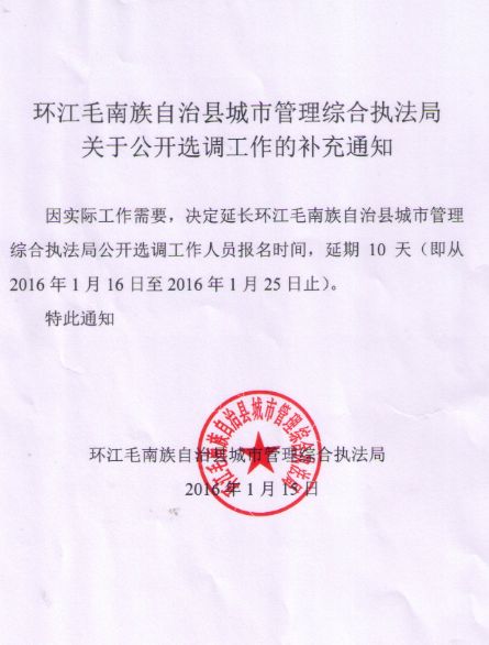 2016廣西環(huán)江縣城市管理綜合執(zhí)法局選調(diào)補充通知