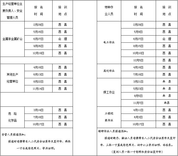 原標(biāo)題:涼山州安全技術(shù)檢測中心2016年安全管理人員、特種作業(yè)人員培訓(xùn)時間安排公告