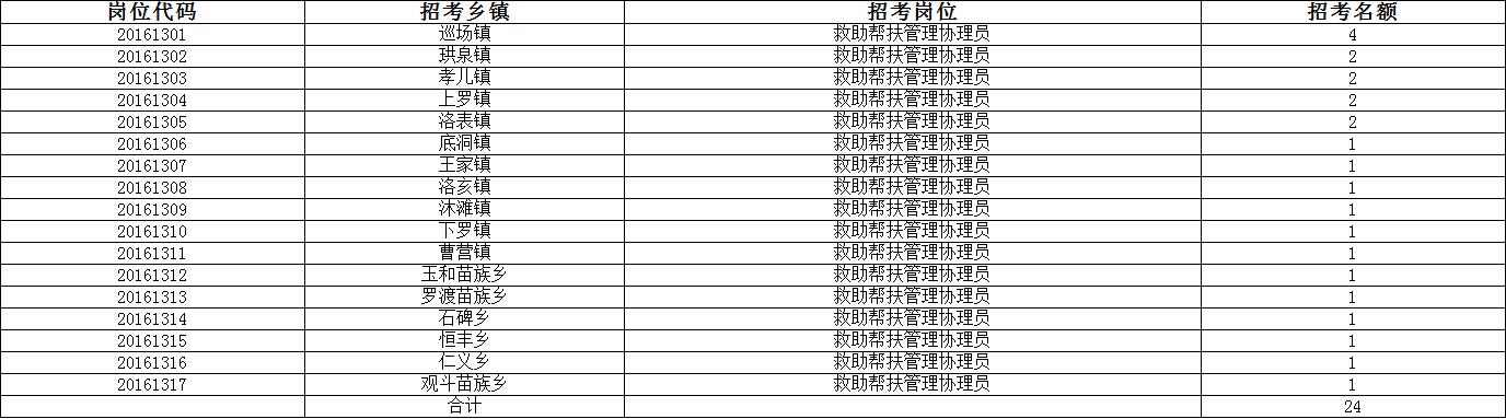 各鎮(zhèn)(鄉(xiāng))社會救助幫扶管理人員共24名(其中巡場鎮(zhèn)4名;珙泉鎮(zhèn)、孝兒鎮(zhèn)、上羅鎮(zhèn)、洛表鎮(zhèn)各2名;底洞鎮(zhèn)、王家鎮(zhèn)、洛亥鎮(zhèn)、沐灘鎮(zhèn)、下羅鎮(zhèn)、曹營鎮(zhèn)、玉和鄉(xiāng)、羅渡鄉(xiāng)、石碑鄉(xiāng)、恒豐鄉(xiāng)、仁義鄉(xiāng)、觀斗鄉(xiāng)各1名。