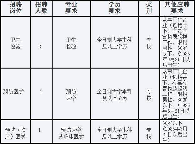 衛(wèi)生檢驗(yàn)崗位3個(gè)、預(yù)防(臨床)醫(yī)學(xué)崗位1個(gè)、預(yù)防醫(yī)學(xué)崗位1個(gè)。