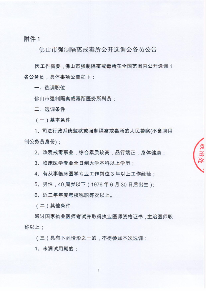 2016廣東佛山市強制隔離戒毒所選調(diào)公務員1名公告