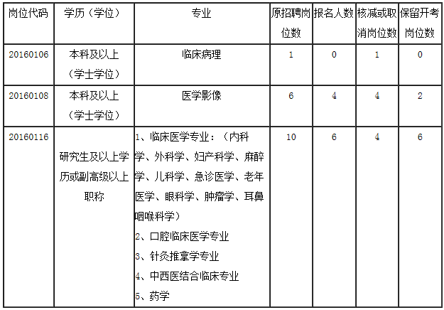 根據(jù)《鳳陽縣人民醫(yī)院2016年公開招聘工作人員公告》要求,于3月9至13日組織了報名和資格審查工作,經(jīng)審定,現(xiàn)將報名后達不到規(guī)定開考比例的部分崗位計劃核減情況予以公布。