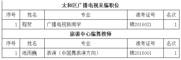 2016年太和區(qū)事業(yè)單位公開招聘工作基本完畢,經(jīng)過筆試、面試、體檢和政治審查等環(huán)節(jié)。擬定程賀和池雨巍錄入下列職位,公示為七天(2016年3月25日至2016年3月31日)。