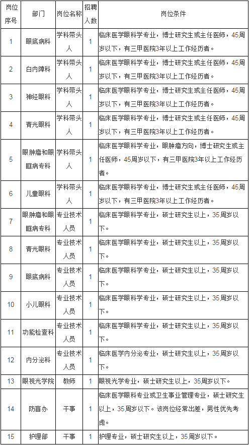 1、報名時間和地點:即日起至2016年4月20日,博士研究生和正高報名時間截止2016年12月31日,招滿為止。報名地點:南昌大學附屬眼科醫(yī)院人事科。