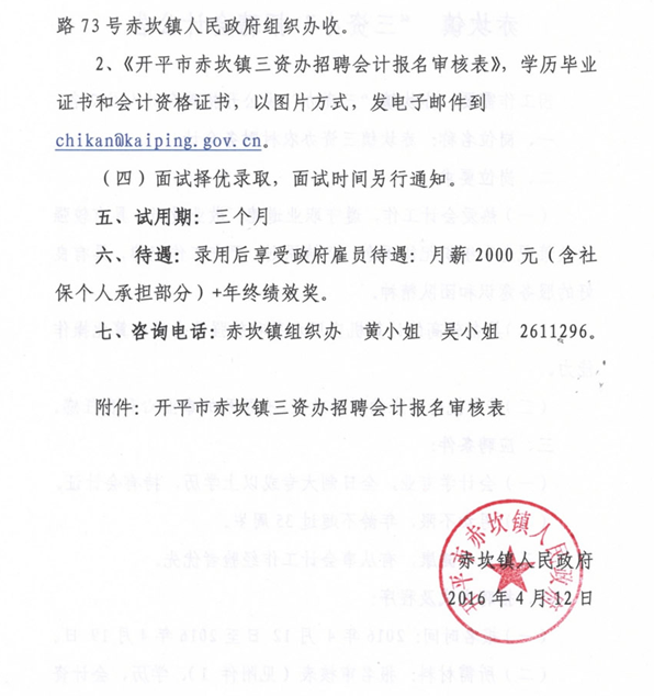 2016廣東開平市赤坎鎮(zhèn)“三資辦”招聘會計公告