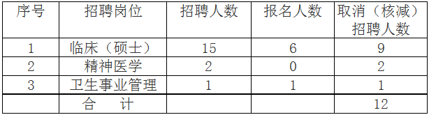根據(jù)《2016年明光市人民醫(yī)院公開招聘工作人員公告》,經(jīng)市人民醫(yī)院公開招聘領(lǐng)導(dǎo)小組會(huì)議研究,對(duì)未達(dá)到2:1開考比例的崗位,取消(核減)招考崗位。具體情況如下: