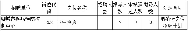 根據(jù)《2016年聊城市市屬事業(yè)單位公開(kāi)招聘工作人員簡(jiǎn)章》關(guān)于“報(bào)名結(jié)束后,對(duì)應(yīng)聘人數(shù)達(dá)不到規(guī)定比例的招聘崗位,計(jì)劃招聘1人的,取消招聘崗位”的規(guī)定,經(jīng)統(tǒng)計(jì)報(bào)考繳費(fèi)人數(shù),聊城市疾病預(yù)防控制中心衛(wèi)生檢驗(yàn)崗位應(yīng)聘人數(shù)未達(dá)到規(guī)定比例,予以取消該崗位招聘計(jì)劃,特此公告: