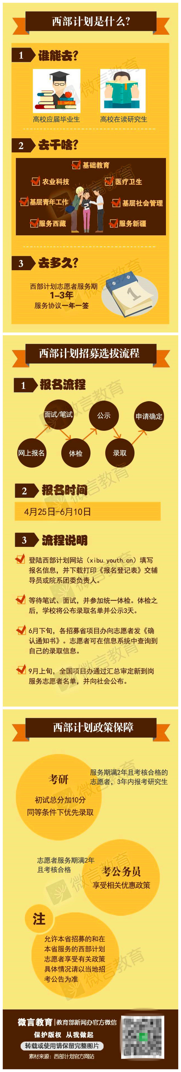 目前,2016年大學(xué)生志愿服務(wù)西部計(jì)劃正在招募中,6月10前接受普通高校應(yīng)屆畢業(yè)生和在讀研究生報(bào)名( http://xibu.youth.cn/)。今年由中央財(cái)政支持的全國(guó)項(xiàng)目計(jì)劃派遣1.83萬(wàn)人左右,想了解更多信息快來(lái)戳下圖!