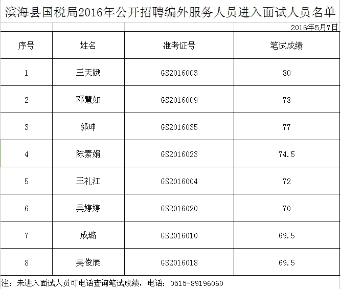 根據(jù)《濱??h國稅局2016年公開招聘編外服務(wù)人員公告》,經(jīng)過筆試,現(xiàn)將進入面試人員名單予以公示(見附表)。面試時間為2016年5月8日(星期日)下午,地點為濱海縣人才服務(wù)中心(縣城人民中路170號)。請參加面試人員攜帶身份證、筆試準考證于5月8日下午2:00前到達指定地點集中,遲到15分鐘者視為自動放棄面試資格。