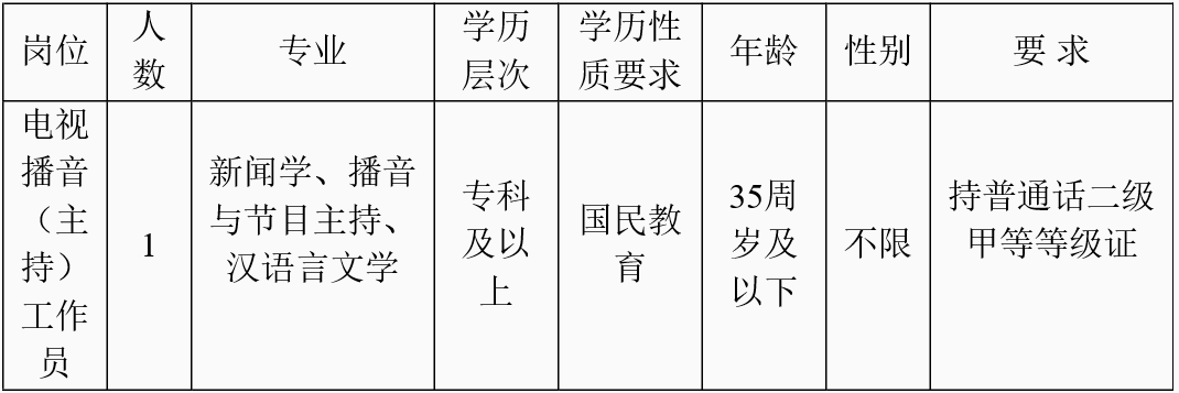 經(jīng)寧洱縣文體廣電旅游局研究,報寧洱縣人民政府、普洱市人力資源和社會局批準,2016年寧洱縣廣播電視臺公開招聘電視播音(主持)工作人員1名,現(xiàn)將公開招聘的有關(guān)事項公告如下: