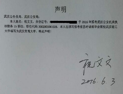 武漢人事考試網(wǎng)2016年6月2日發(fā)布的《武漢市2016年度考試錄用公務員資格復審公告》中,報考“武漢市公安局中心城區(qū)分局執(zhí)法勤務職位15”考生祝文文,因個人筆誤,畢業(yè)院校填寫錯誤。經(jīng)考生申請,將其畢業(yè)院校更正為“武漢輕工大學”。
