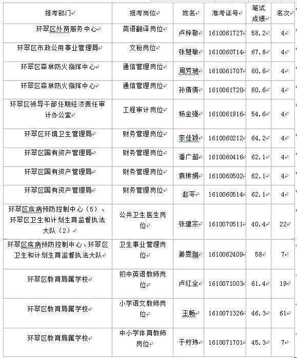 根據(jù)《關(guān)于確定2016年威海市環(huán)翠區(qū)屬事業(yè)單位公開招聘筆試合格分?jǐn)?shù)線和面試資格審查有關(guān)問題的通知》規(guī)定,面試人選因資格審查不合格、棄權(quán)或遞補棄權(quán)造成職位上的人員空缺,由招錄機關(guān)按筆試成績依次遞補?,F(xiàn)將遞補名單予以公布。請下列考生于6月12日下午4點之前提交資格審查材料,具體要求見《關(guān)于確定2016年威海市環(huán)翠區(qū)屬事業(yè)單位公開招聘筆試合格分?jǐn)?shù)線和面試資格審查有關(guān)問題的通知》。