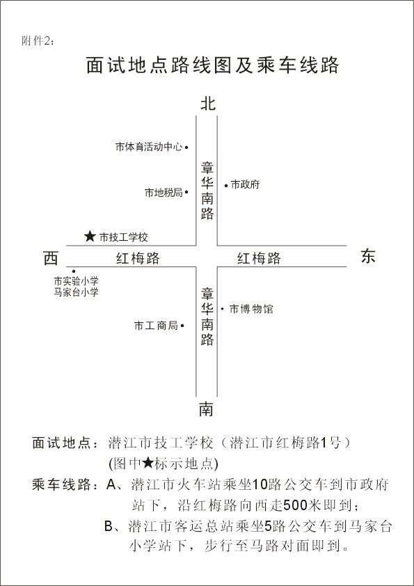 中午12:00——12:30考生在潛江市技工(路線圖及乘車線路見附件2)教學樓一樓教室集合。