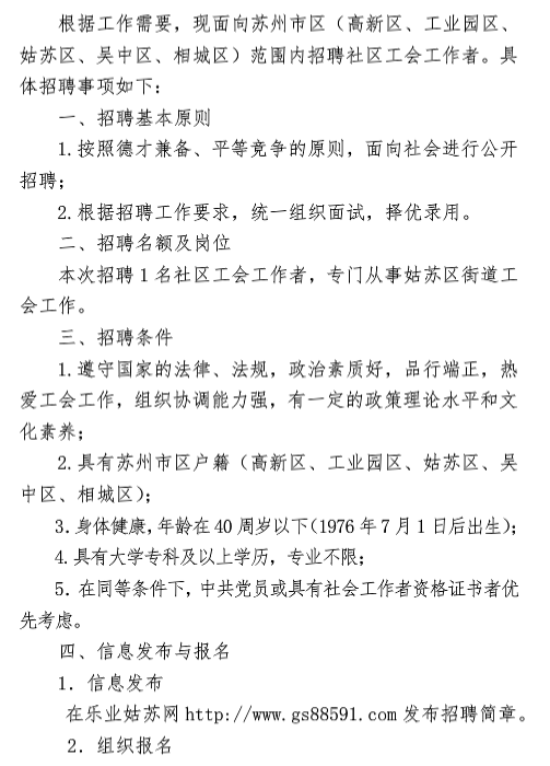 2016江蘇姑蘇區(qū)總工會招聘社區(qū)工會工作者公告【招1人】