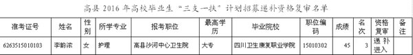 高縣2016年高校畢業(yè)生“三支一扶”計(jì)劃招募遞補(bǔ)資格復(fù)審名單