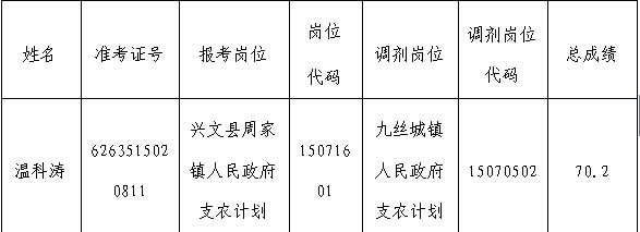 根據(jù)《2016年四川省高校畢業(yè)生“三支一扶”計劃招募公告》的規(guī)定,對有人參加筆試,無人參加面試的崗位,縣人力資源社會部門可在本縣報考同一項目中參加面試且同意調(diào)劑的考生中從到低分進行調(diào)劑招募。報考我縣九絲城鎮(zhèn)人民政府支農(nóng)計劃(崗位代碼:15070502)一考生主動放棄面試資格出現(xiàn)缺額,經(jīng)研究,決定調(diào)劑,現(xiàn)就調(diào)劑相關(guān)事項公告如下: