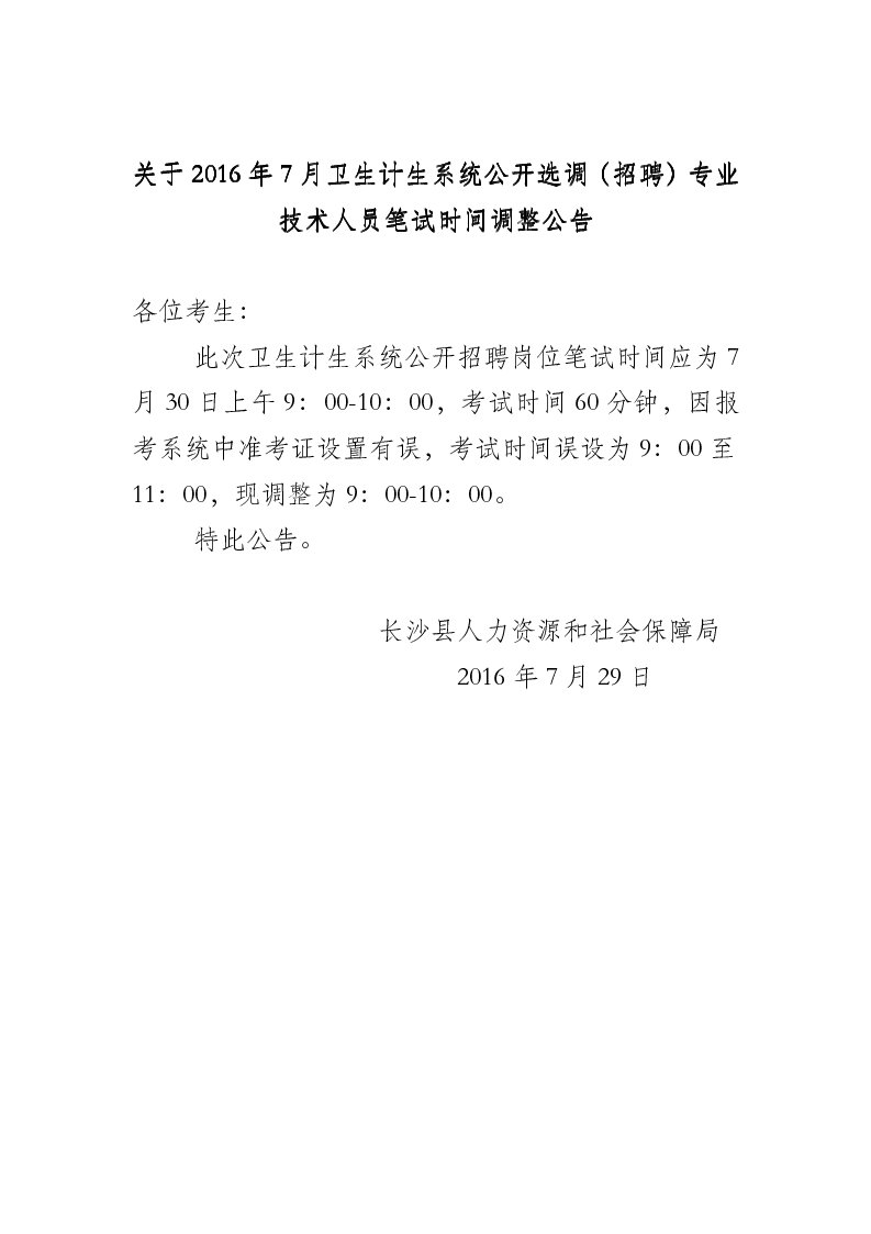 2016年7月湖南長沙市長沙縣衛(wèi)生計生系統(tǒng)選調(diào)專業(yè)技術(shù)人員筆試時間調(diào)整公告