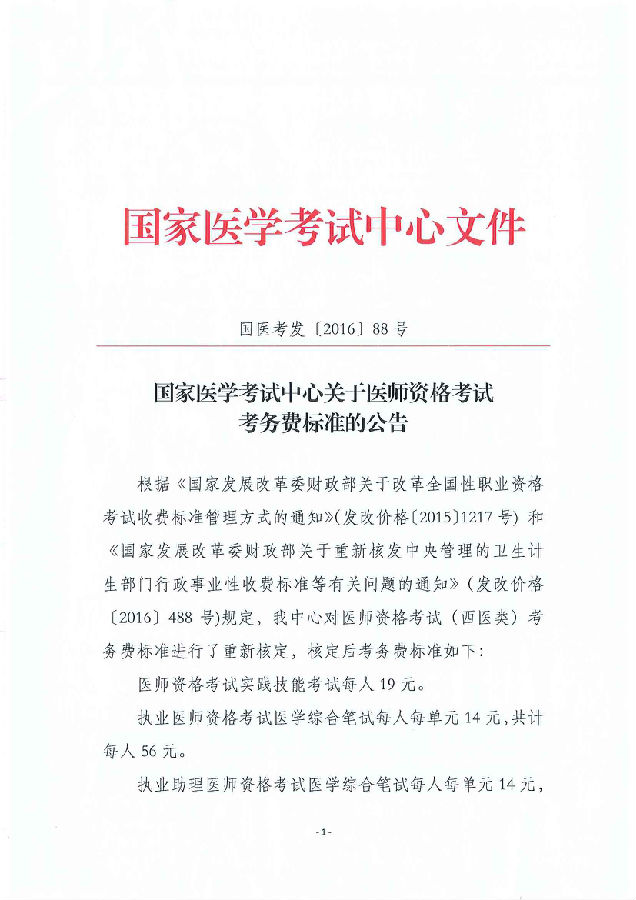 2016國家醫(yī)學考試中心醫(yī)師資格考試考務費標準公告