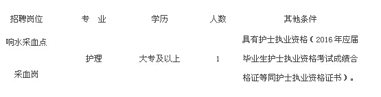 為滿足響水采血點業(yè)務發(fā)展需要,經(jīng)研究決定,面向社會公開招聘編外合同制護理人員?,F(xiàn)將有關事項公告如下: