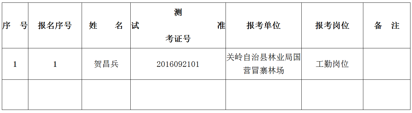根據(jù)《關(guān)嶺自治縣林業(yè)局2016年公開比選事業(yè)單位比選公告》要求,報(bào)名及資格審查工作已經(jīng)結(jié)束,資格審查合格1人,進(jìn)入面試人員1人。現(xiàn)將進(jìn)入面試人員公示及相關(guān)事宜公告如下: