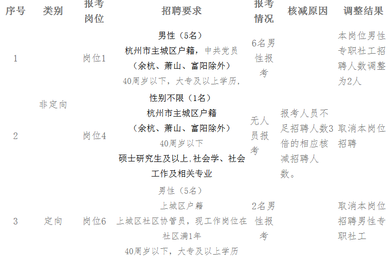 根據(jù)《上城區(qū)2016年度專職社區(qū)工作者招聘公告》關(guān)于“各招聘崗位報考人員不足招聘人數(shù)3倍的相應(yīng)核減招聘人數(shù)”的規(guī)定。調(diào)整后的招聘人數(shù)分別為: