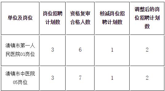 清鎮(zhèn)市2016年衛(wèi)生系統(tǒng)公開(kāi)招聘事業(yè)單位工作人員資格復(fù)審工作已結(jié)束。按照《清鎮(zhèn)市2016年衛(wèi)生系統(tǒng)公開(kāi)招聘事業(yè)單位工作人員簡(jiǎn)章》中“通過(guò)資格復(fù)審人數(shù)與崗位招聘計(jì)劃數(shù)之比達(dá)不到3?1的,減少該崗位招聘計(jì)劃數(shù)(例:某崗位招聘計(jì)劃數(shù)為2,通過(guò)資格復(fù)審人數(shù)為4或5,則該崗位招聘計(jì)劃數(shù)減少為1,依此類推)”的規(guī)定,現(xiàn)將清鎮(zhèn)市第一人民醫(yī)院01崗位、清鎮(zhèn)市中醫(yī)院05崗位招聘計(jì)劃數(shù)調(diào)整如下: