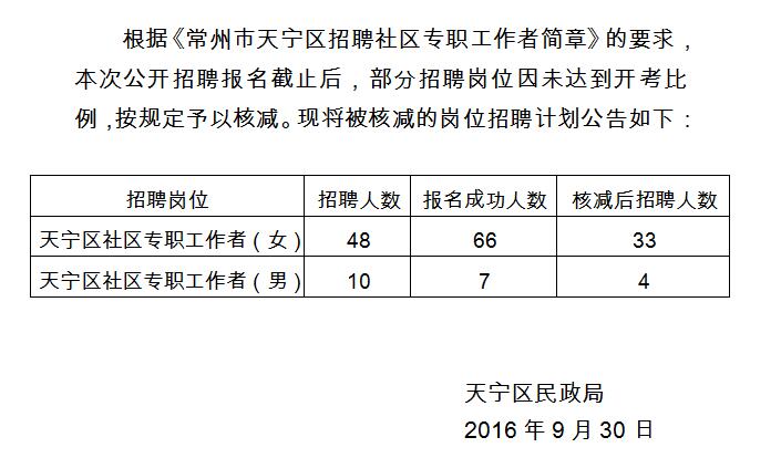 原標題:常州市天寧區(qū)2016年招聘社區(qū)專職工作者核減崗位招聘計劃的公告