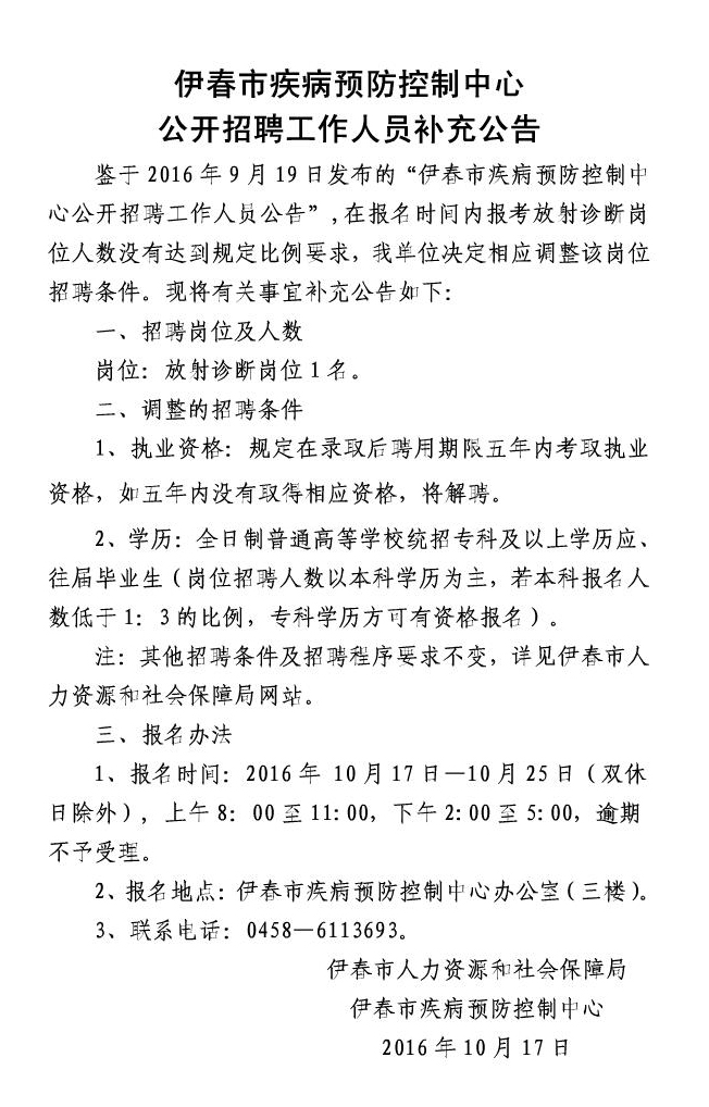 原標(biāo)題:伊春市疾病預(yù)防控制中心公開招聘工作人員補(bǔ)充公告