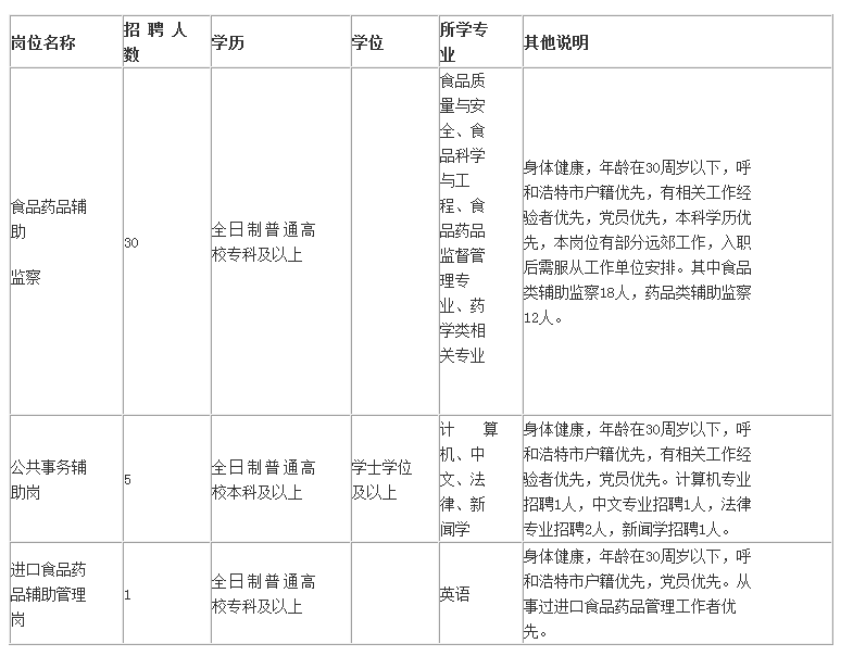 為公眾飲食用藥安全水平,更好的服務(wù)于食品醫(yī)藥經(jīng)濟(jì)平穩(wěn)較快發(fā)展,呼和浩特市賽罕區(qū)食品藥品監(jiān)督局全權(quán)委托內(nèi)蒙古聚英人力資源服務(wù)中心擬招聘36名勞務(wù)派遣人員,具體事宜如下: