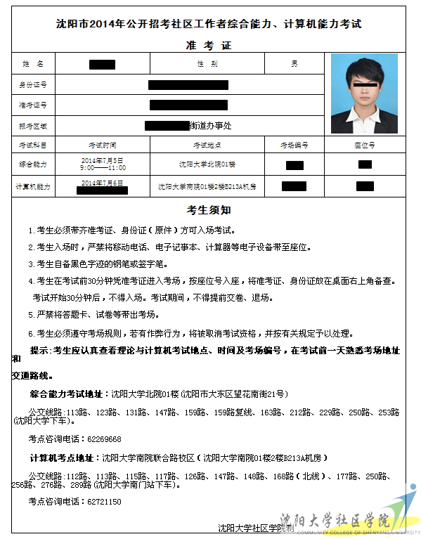 進(jìn)入沈陽大學(xué)社區(qū)學(xué)院考試網(wǎng)首頁,選擇“信息查詢”輸入您注冊(cè)時(shí)姓名和身份證號(hào),登陸后再選擇"打印準(zhǔn)考證",打印本人本次考試準(zhǔn)考證。