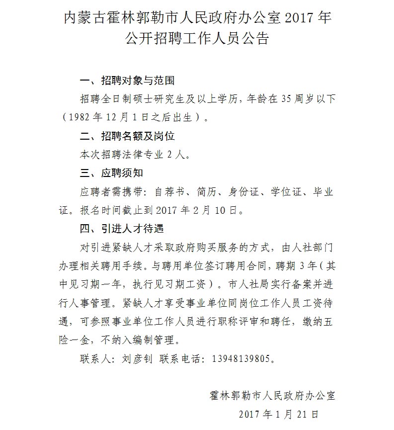 2017內(nèi)蒙古霍林郭勒市人民政府辦公室招聘公告【招2人】