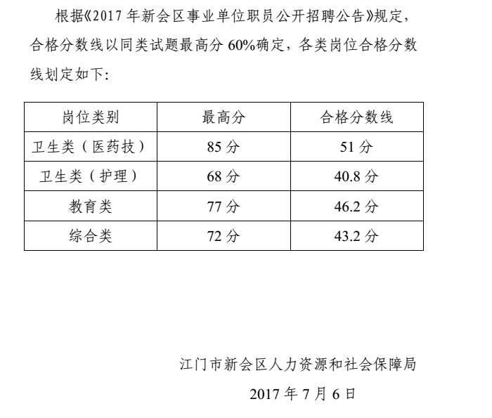 2017江門新會區(qū)事業(yè)單位職員公開招聘筆試合格分?jǐn)?shù)線