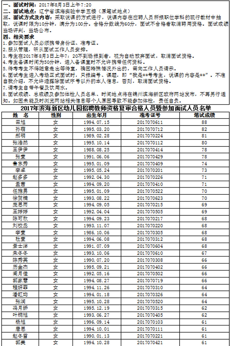 2017遼寧錦州濱海新區(qū)幼兒教師招聘面試公告