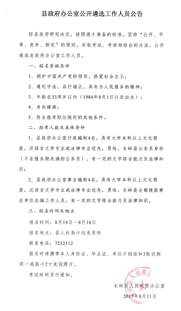 注:本文來源長嶺縣人民政府,原標題:縣政府辦公室公開遴選工作人員公告。
