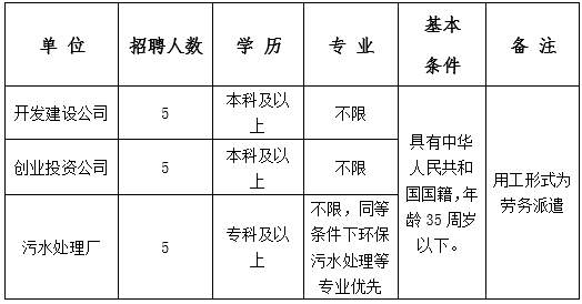 2、試用期滿合格,予以正式轉(zhuǎn)正;試用期滿不合格,予以退回勞務(wù)派遣公司。轉(zhuǎn)正后薪酬按照企業(yè)相關(guān)標準執(zhí)行:污水處理廠3000元/月起;開發(fā)建設(shè)公司和創(chuàng)業(yè)投資公司3800元/月起。