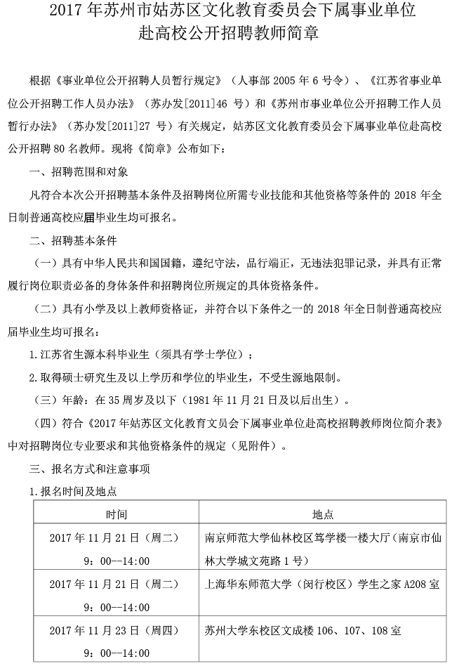 2017江蘇蘇州市姑蘇區(qū)文化教育委員會(huì)下屬事業(yè)單位赴高校招聘教師公告【招80人】