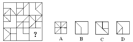 (解答:每行前兩個圖形疊加后,不同的部分就是第三個圖形。正確答案是D。)