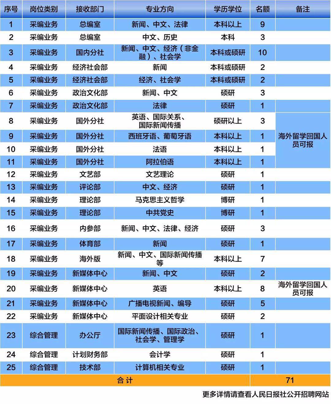 2018年報(bào)社計(jì)劃公開(kāi)招聘接收應(yīng)屆高校畢業(yè)生71名,具體崗位及要求見(jiàn)附表,詳情請(qǐng)參閱人民日?qǐng)?bào)社公開(kāi)招聘網(wǎng)站“校園招聘”。
