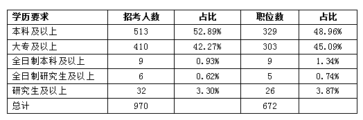 從招錄學歷來看,學歷門檻要求“本科及以上”的職位占總職位數(shù)的50.3%,占總職位數(shù)的一半以上,考生們要注意的是有9人、9個職位數(shù)僅限全日制本科以上學歷,還有6人、5個職位要求全日制研究生及以上,如果是通過自學考試、函授、成人教育、網(wǎng)絡(luò)教育、夜大、電大等方式取得的學歷不能報考要求全日制學歷的職位。
