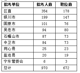 從榜單可以看出,區(qū)直機關(guān)招錄人數(shù)領(lǐng)銜其他地市,以354人、178個職位蟬聯(lián)寶座,區(qū)直機關(guān)招錄中自治區(qū)高級人民法院招錄規(guī)模,招錄138人、61個職位。首府銀川市緊隨其后,招錄199人、147個職位,此外,固原市招錄人數(shù)也在一百以上,規(guī)模較大,機會更多,考生們可重點考慮。