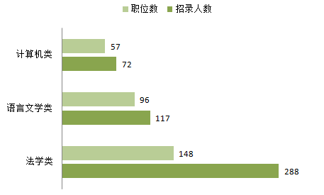 本次考試招錄中,法學類、語言文學類以及計算機類這三類專業(yè)需求量較大,其中尤以法學類專業(yè)人氣最旺,288個職位、148人招錄法學類人才,占到總職位數(shù)的22%,有法學類專業(yè)背景的考生有很大的選擇空間,要結(jié)合自身的學歷、資格證書等其他條件最終選出自己心儀的職位。