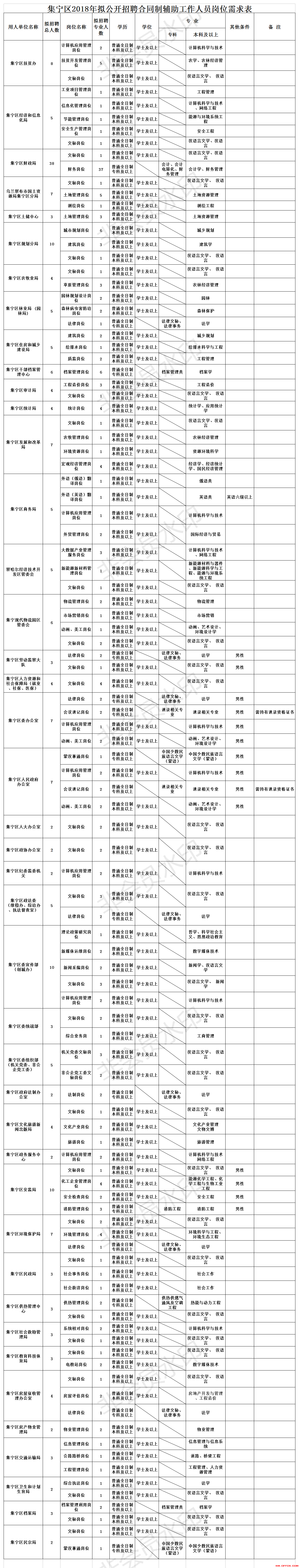 為了有效緩解集寧區(qū)各類(lèi)人員短缺的現(xiàn)狀,更好地推進(jìn)我區(qū)各項(xiàng)事業(yè)快速發(fā)展,經(jīng)區(qū)委、區(qū)政府研究決定,擬面向社會(huì)公開(kāi)招考聘用合同制輔助工作人員。本次擬計(jì)劃公開(kāi)招聘合同制輔助工作人員225名,涉及55個(gè)崗位,近70個(gè)專(zhuān)業(yè),詳情請(qǐng)見(jiàn)《集寧區(qū)2018年擬公開(kāi)招聘合同制輔助工作人員崗位需求表》。報(bào)考時(shí)間擬定為2018年9月6日,考試時(shí)間擬定為9月15日。具體招聘事宜以烏蘭察布市人事考試信息網(wǎng)(http://www.wmpta.org.cn)公告為準(zhǔn),請(qǐng)報(bào)考人員隨時(shí)關(guān)注。