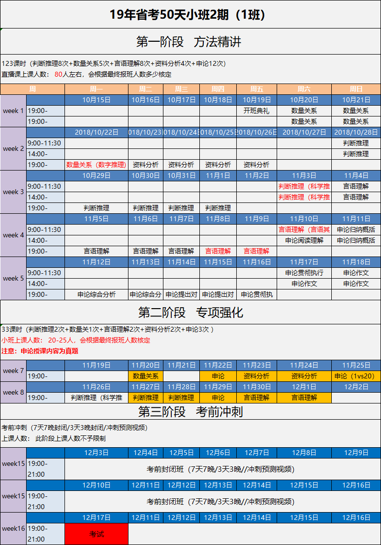 2019年省考小班私教直播特訓(xùn)營(yíng)課程安排表