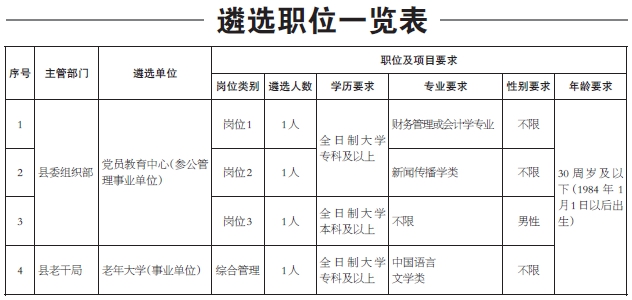 縣內(nèi)機(jī)關(guān)單位在編在崗的公務(wù)員、事業(yè)單位參公人員可報(bào)考黨員教育中心;縣內(nèi)機(jī)關(guān)單位在編在崗的公務(wù)員、事業(yè)單位參公或事業(yè)身份人員可報(bào)考縣老年大學(xué)。